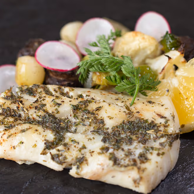Mediterranean-style baked cod with garlic, lemon, and fresh herbs.