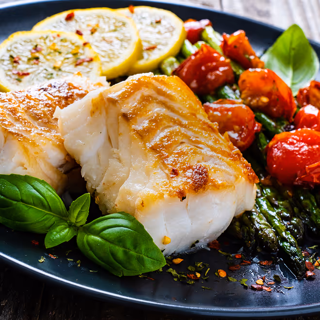 A tender pan-seared cod with a crisp, golden exterior and flaky center, finished with lemon and herbs.